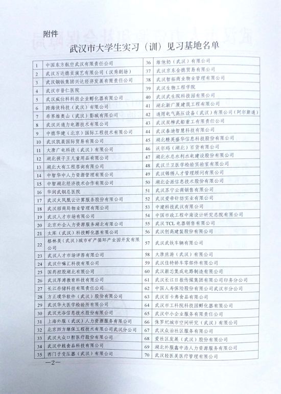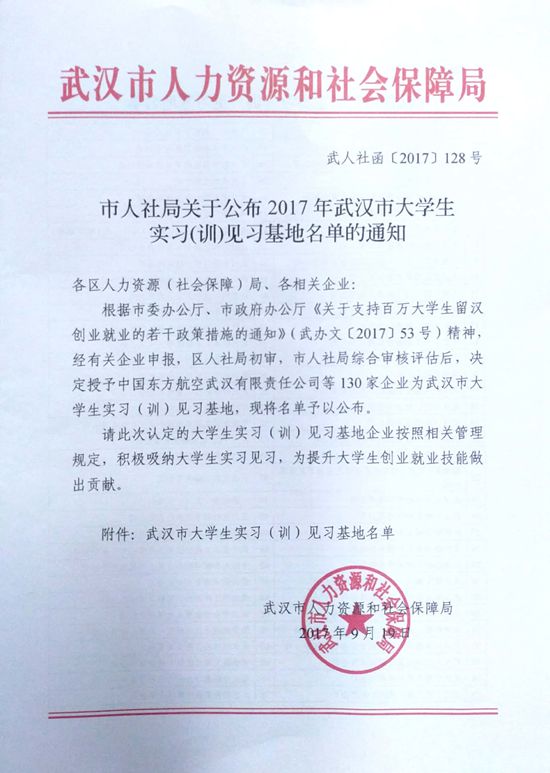 為大力實(shí)施“百萬(wàn)大學(xué)生留漢創(chuàng)業(yè)就業(yè)計(jì)劃”,貫徹落實(shí)武漢市委辦公廳、市政府辦公廳《關(guān)于支持百萬(wàn)大學(xué)生留漢創(chuàng)業(yè)就業(yè)的若干政策措施》文件精神,武漢市人力資源和社會(huì)保障局組織專班通過(guò)實(shí)地走訪的形式對(duì)企業(yè)進(jìn)行考察和評(píng)估,經(jīng)多輪遴選,我司被確認(rèn)為2017年武漢市大學(xué)生實(shí)習(xí)(訓(xùn))見(jiàn)習(xí)基地。